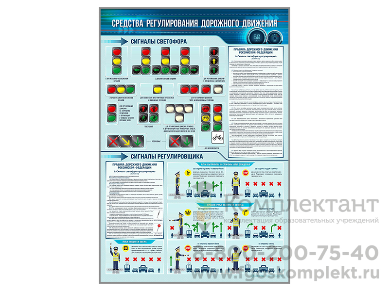 Стенд предназначен для наглядного отображения информации о сигналах светофора и регулировщика согласно Правилам дорожного движения РФ, а также для формирования у учащихся автошкол знаний о технических средствах организации дорожного движения.