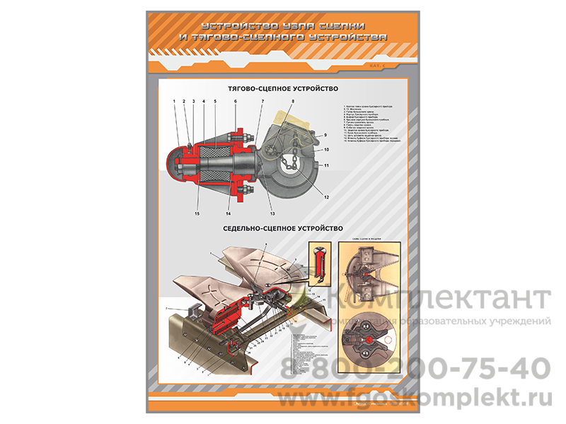Стенд представляет собой информационную панель, на которой размещены сведения об устройстве узла сцепки и тягово-сцепного устройства.