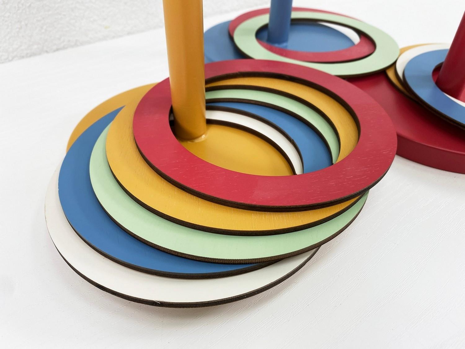 Кольцеброс – традиционная игра на развитие ловкости, меткости и глазомера. Состоит из трёх цветных колышков разной высоты и комплекта колец, которые нужно накинуть на эти колышки с определённого расстояния.