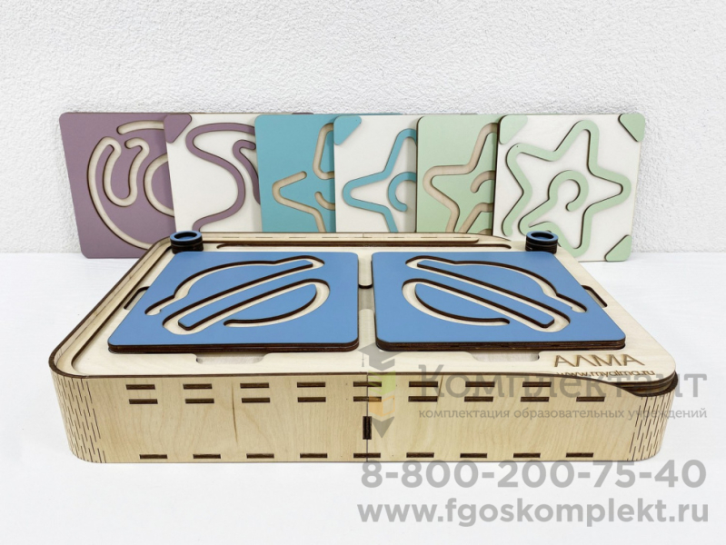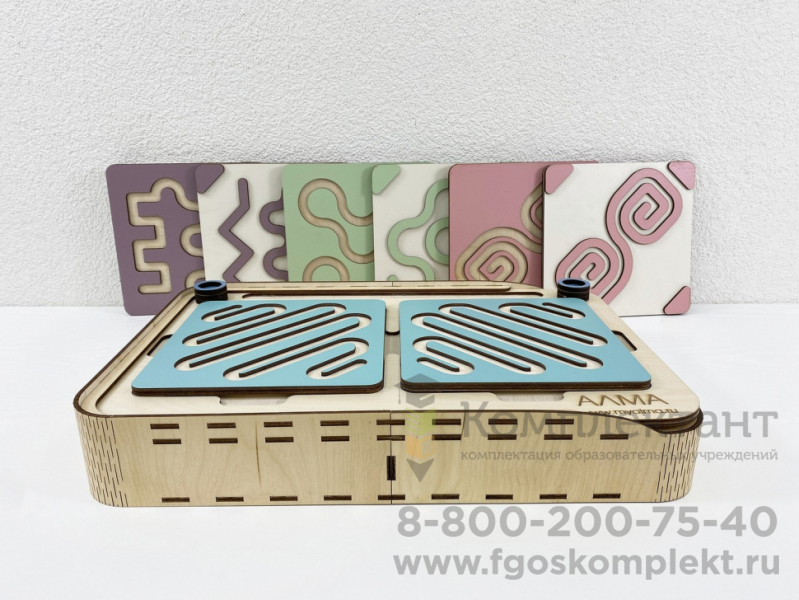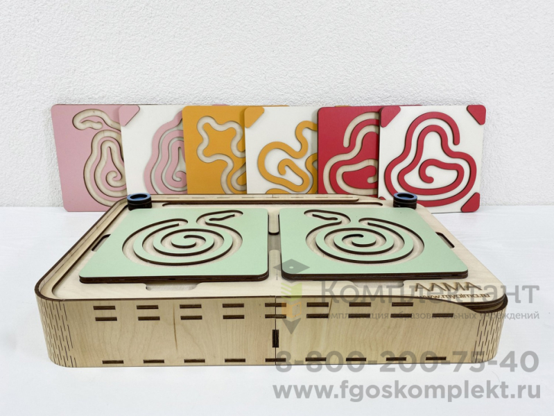 Это нейроигрушка для развития межполушарного взаимодействия. Состоит из коробки-основания и цветных лабиринтов-вкладышей. Два лабиринта с зеркально изображёнными картинками устанавливаются в пазы, и ребёнок проходит их с помощью специальных пальчиковых фишек.