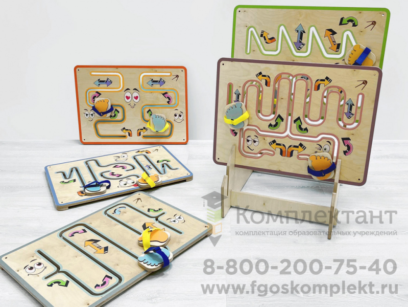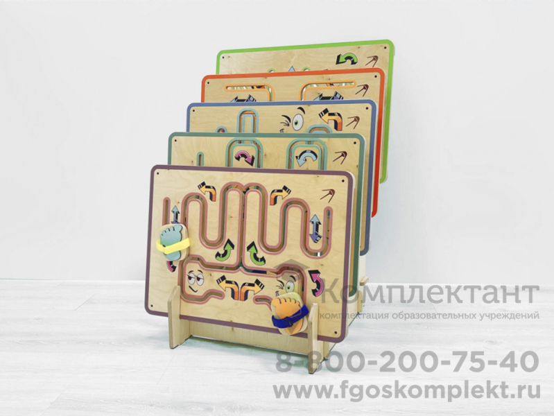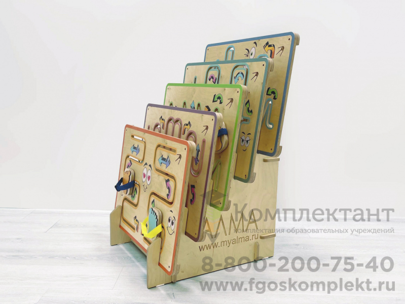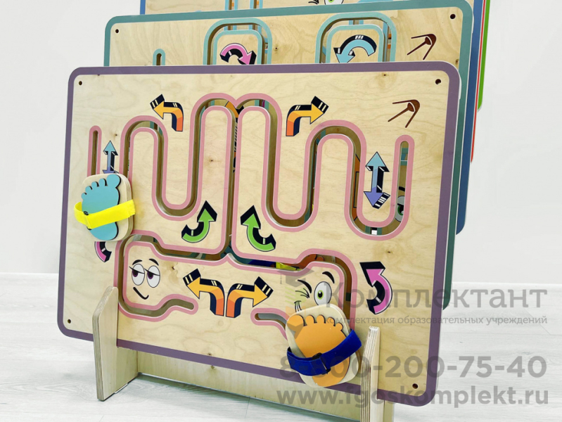 В комплекте идёт пять платформ-лабиринтов и подставка для них. Можно повесить все сразу, если позволяет помещение, можно только одну — и заменять платформы по мере надобности. В методическом пособии собраны варианты занятий, которые можно проводить с детьми.