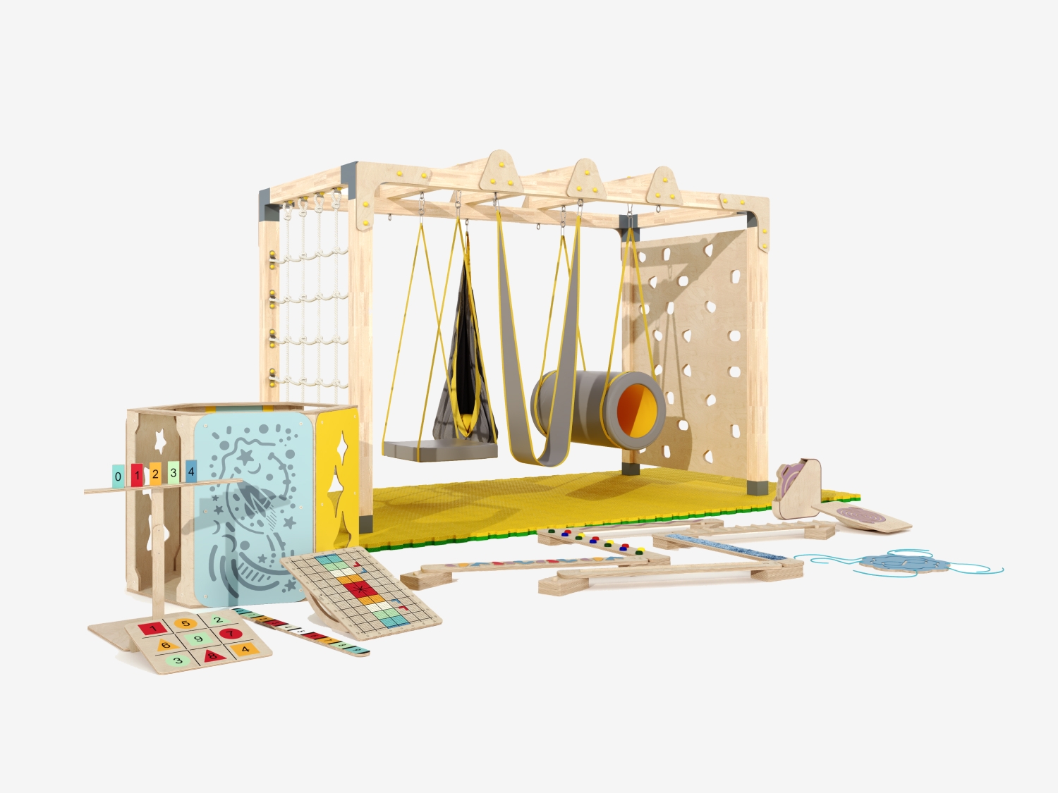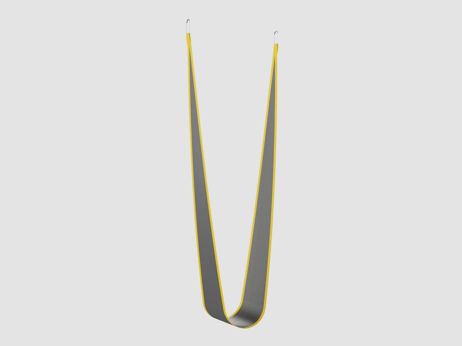 Качели-лента выполнены из водостойкой пвх-ткани в сером и жёлтом цветах. Качели можно приобрести отдельно или в составе спортивно-игрового комплекса «Сенсорум».