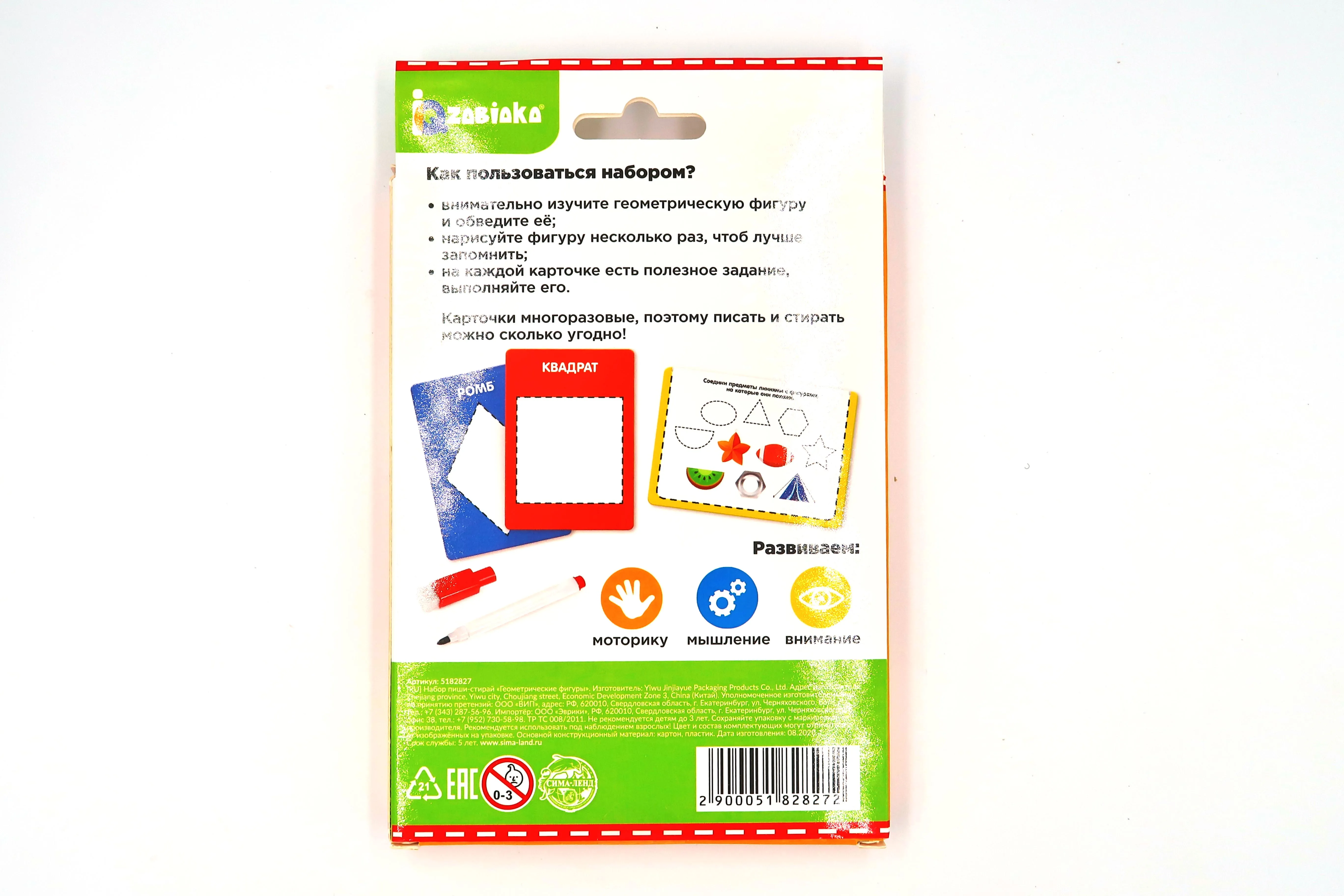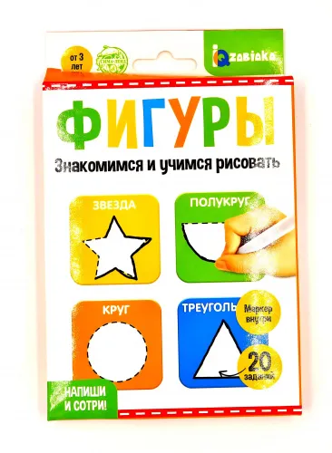 Многоразовая игра с маркером Пиши-стирай «Фигуры» — это простой и удобный способ подготовить руку к письму, научиться выводить цифры и печатные буквы. С помощью маркера ребёнок обведёт символы и фигурки по пунктирным линям, а если ошибётся, сотрёт ластиком с колпачка и напишет всё заново. Развивает логику, моторику рук. В процессе игры ребенок изучает цвета и фигуры.